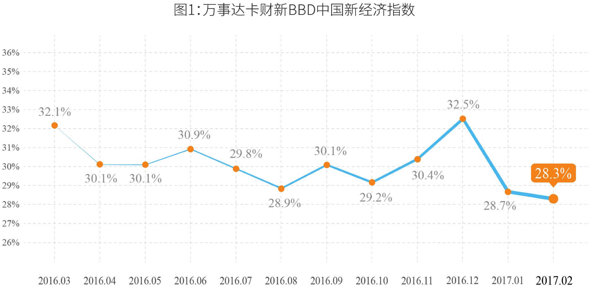 2017年2月,万事达卡财新BBD中国的新经济指数(NEI)为28.3,即新经济投入占整个经济投入的比重为28.3%。该值较2017年1月的28.7继续下降0.4个百分点,是新经济指数公布以来的最低值(图1)。NEI新经济据于以下定义:首先,高人力资本投入、高科技投入、轻资产。其次,可持续的较快增长。第三,符合产业发展方向。NEI所含行业详见第二部分和《万事达卡财新BBD中国新经济指数技术报告》。